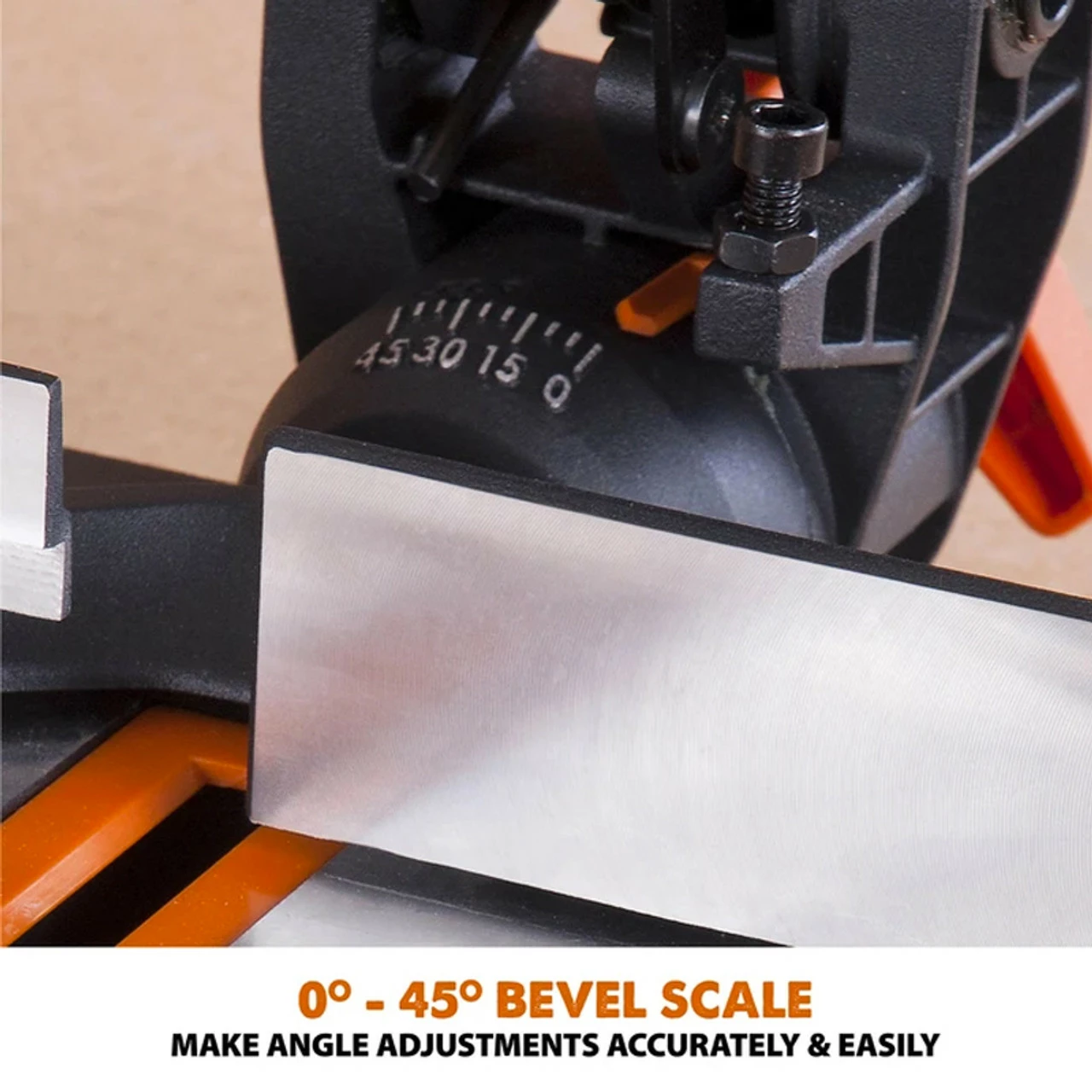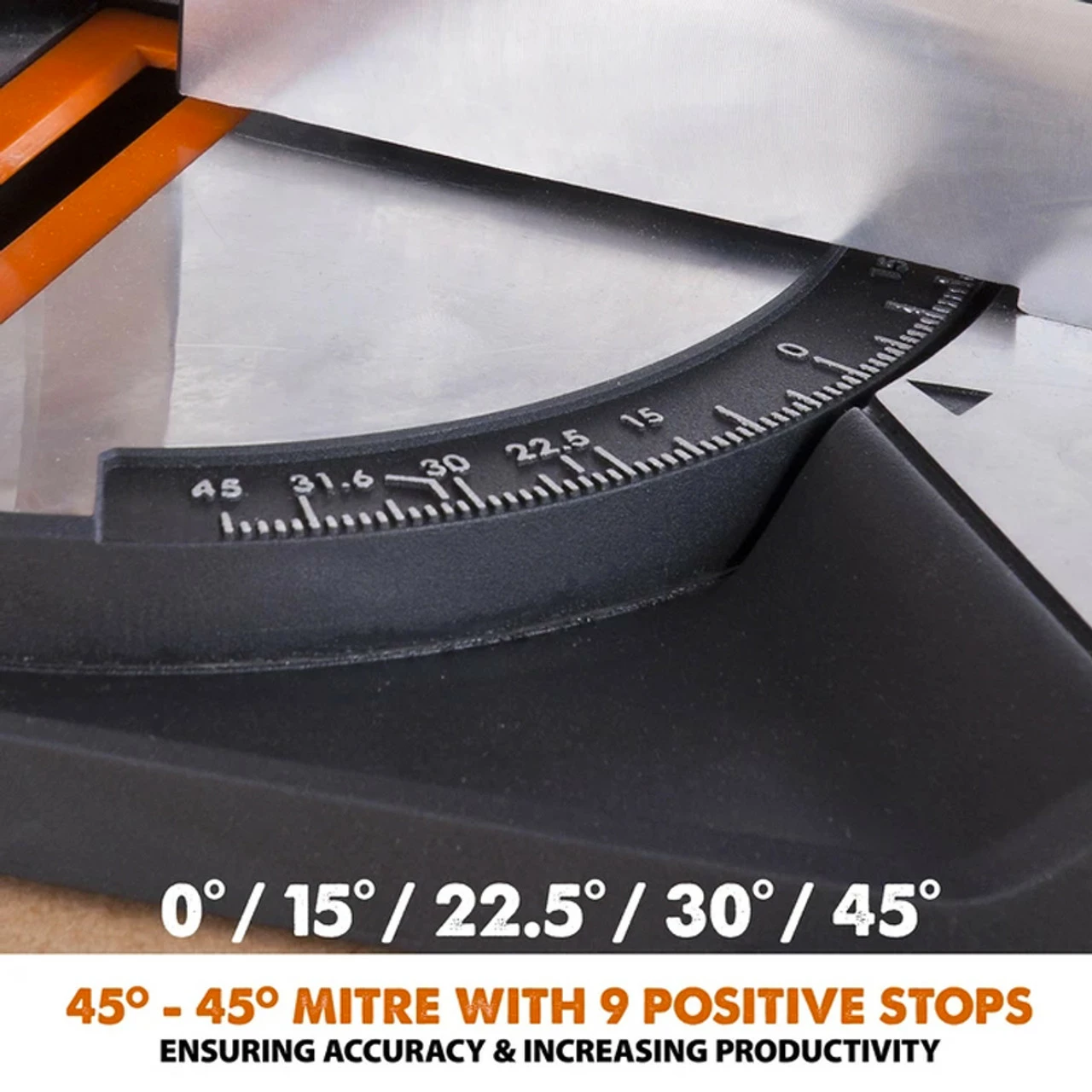 - Positive mitre stops both left & right at 0˚, 15, 22.5, 30, and 45˚ covers all common cutting angles accurately and reliably.