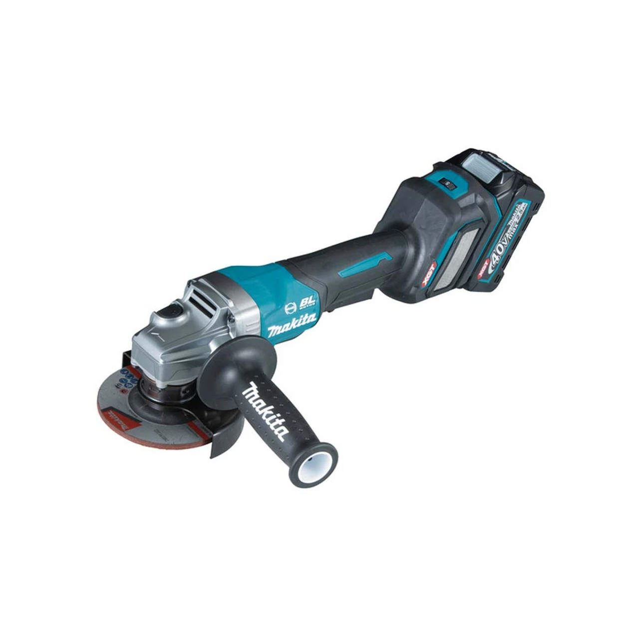 The GA028GD201 comes with 2x 2.5Ah 40V batteries, a DC40RA fast battery charger, a Makpac Type 4 connector case, a side handle, a grinding wheel, and a lock nut wrench.