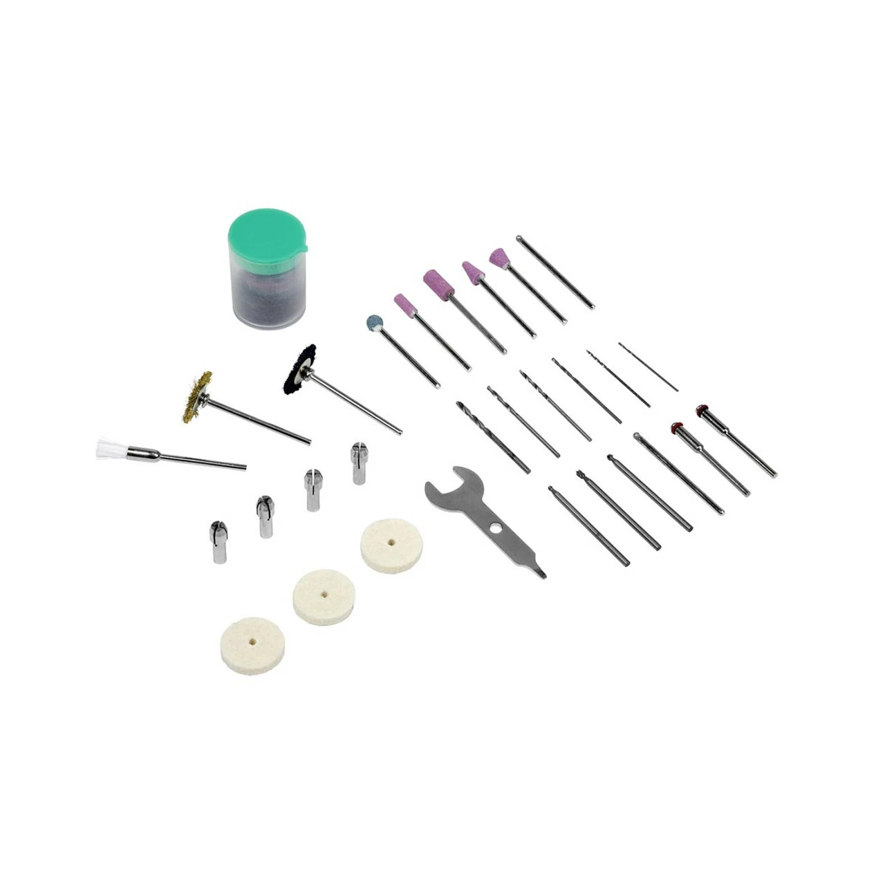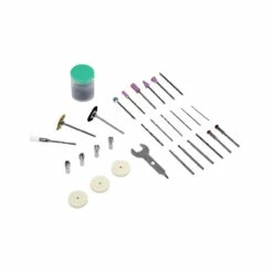 - Supplied with a 50-piece range of tips, wheels, discs, dressing stones and a chuck spanner.