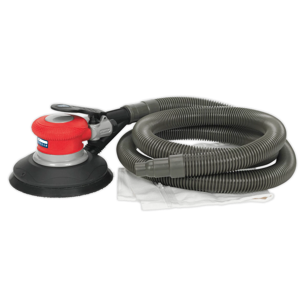 Variable speed control lever for quick adjustment to suit workpiece. Features a self-generated vacuum with hose and bag. Supplied with 150mm hook-and-loop pad.