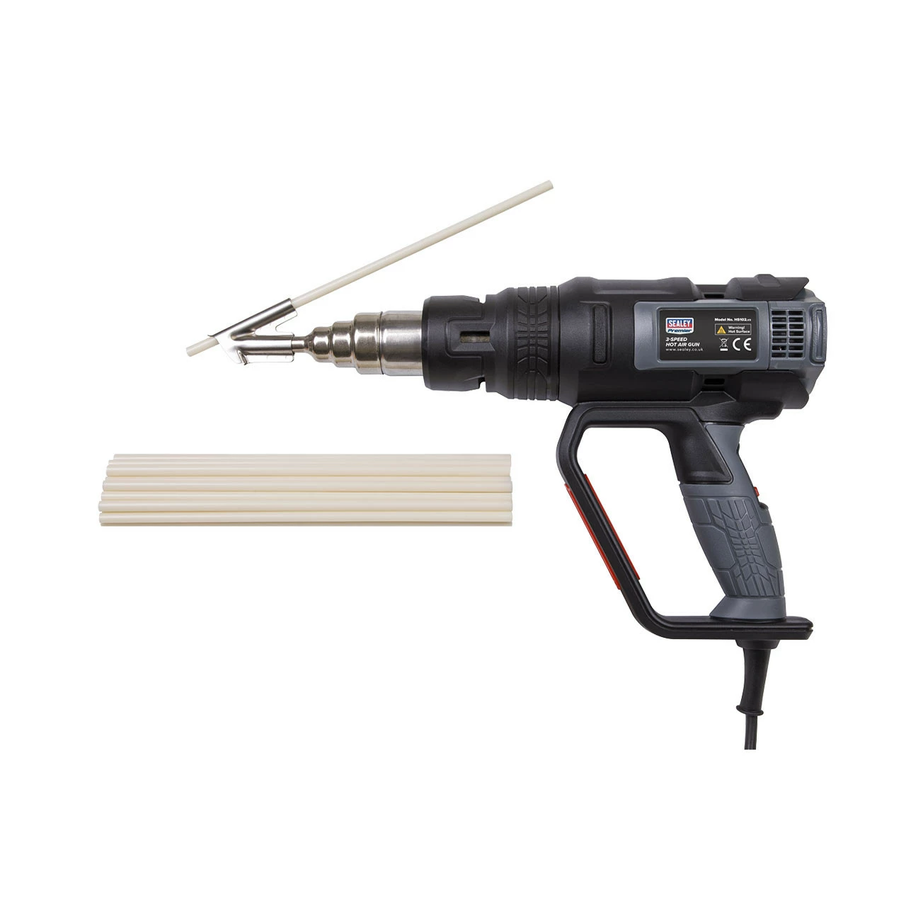 The Sealey HS102K is a hot air gun kit supplied with two plastic welding nozzles, a starter pack of 36 ABS welding rods and a concise instruction manual. The hot air gun has a triple-range variable electronic temperature control. Applications of the hot air gun include plastic welding, paint stripping, soft soldering, removing sticky labels, defrosting frozen pipes, etc.