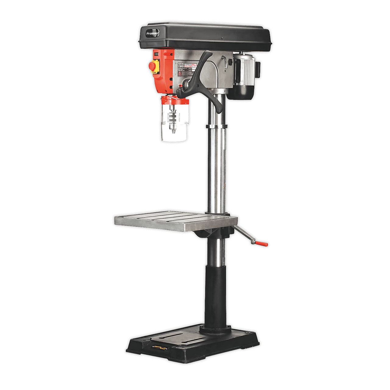 One of a comprehensive range of Premier floor standing pillar drills for the professional workshop. Features heavy-duty aluminium-bodied motor for long and reliable performance. No-volt release switch to prevent inadvertent start up and pulley cover protected by microswitch to prevent drill operating when cover is open. Fitted with an integral work light which illuminates the drilling table giving operator a clear view of the drilling process. Supplied with an electrically inter-locked chuck guard. Large sized square table fitted with precision rack and pinion height adjustment.